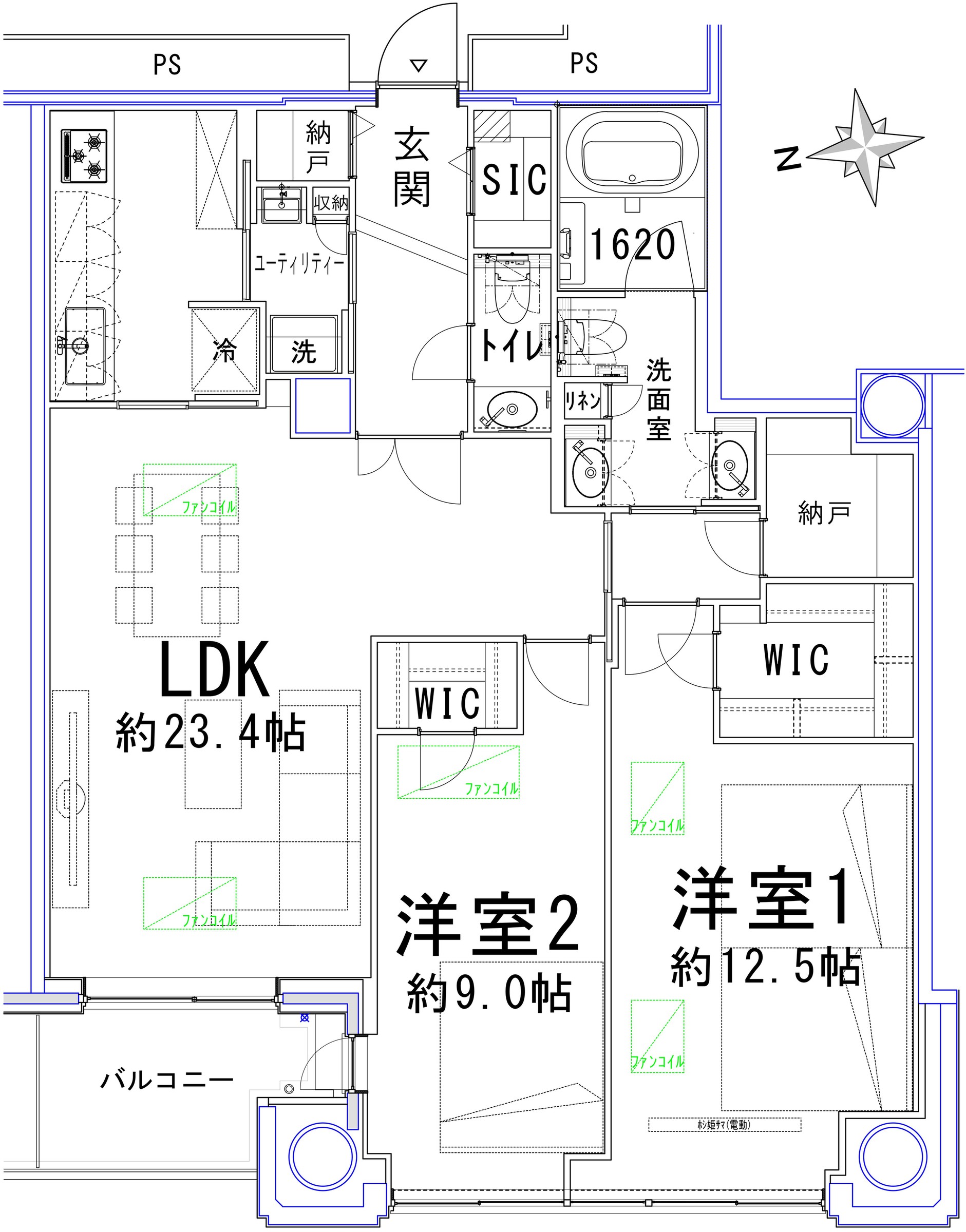 This 2LDK unit features an exclusive area of approximately 104.44 sq.m and a balcony area of 5.475 sq.m. It includes an LDK of about 23.4 tatami mats, plus Western-style rooms of approximately 12.5 and 9.0 tatami mats. The layout offers unobstructed views and excellent sunlight. |