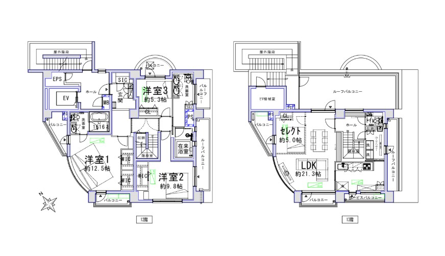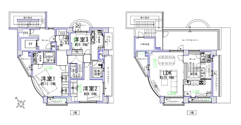 Exclusive area: 155.49 sq.m. LDK: 48.8 sq.m. Western-style rooms: 22.8 sq.m., 17.8 sq.m., and 9.6 sq.m. High storage capacity is also noteworthy. Top floor, single unit spanning 2 floors, maisonette-style residence.