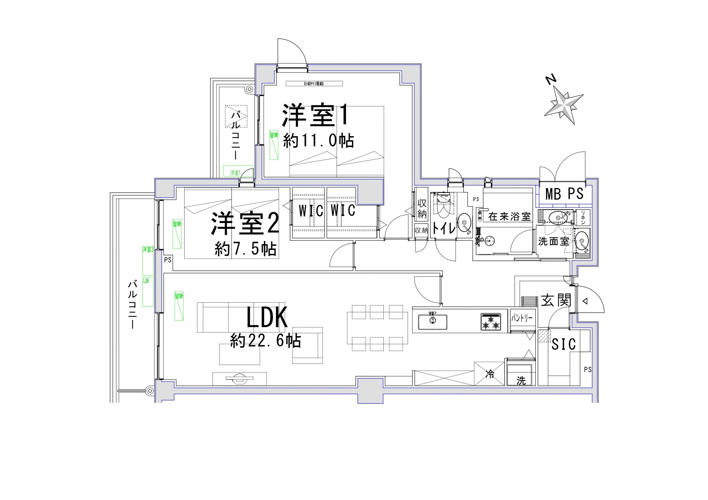 A spacious 2-bedroom apartment featuring two balconies, an approximately 22-tatami-mat living-dining-kitchen area, and ample storage space.