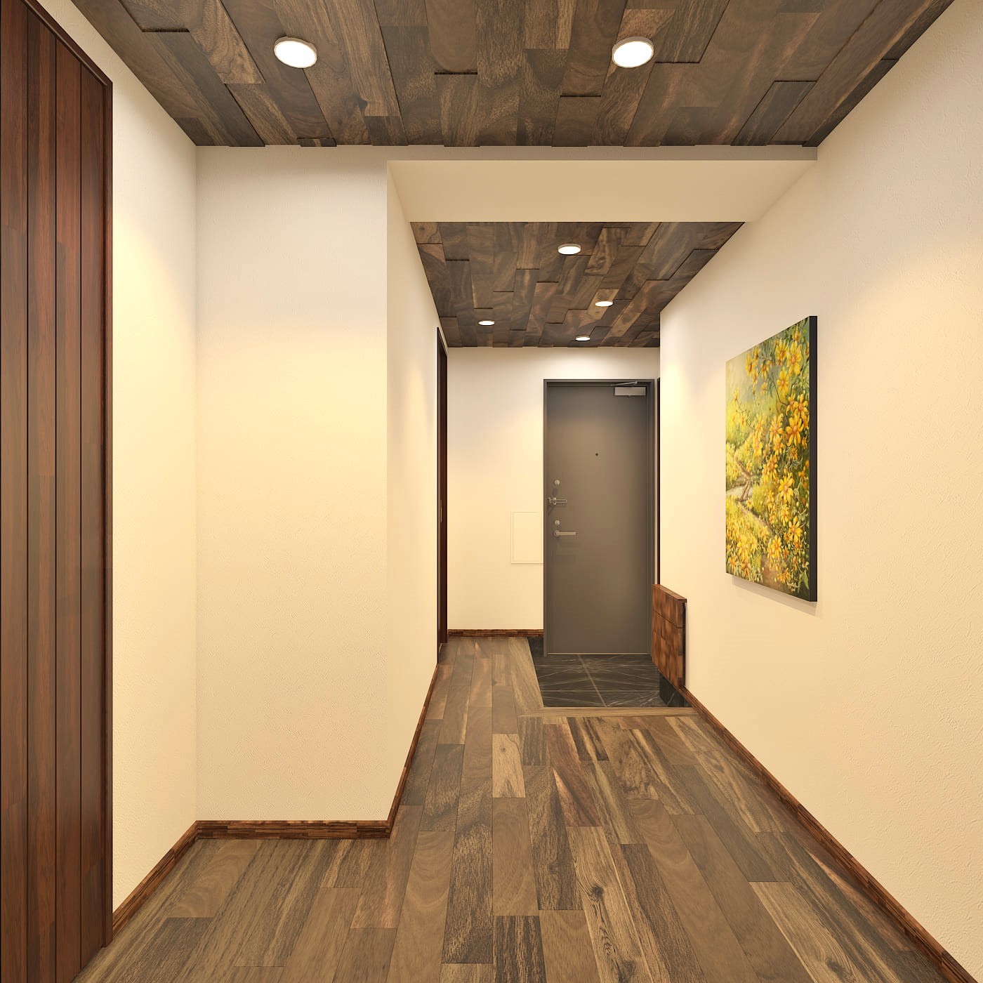 The ceilings and flooring are made of natural solid wood, and the black stone-patterned tile flooring creates an elegant atmosphere. There is a spacious shoe closet located next to the entrance. 【Rendering of the completed building】