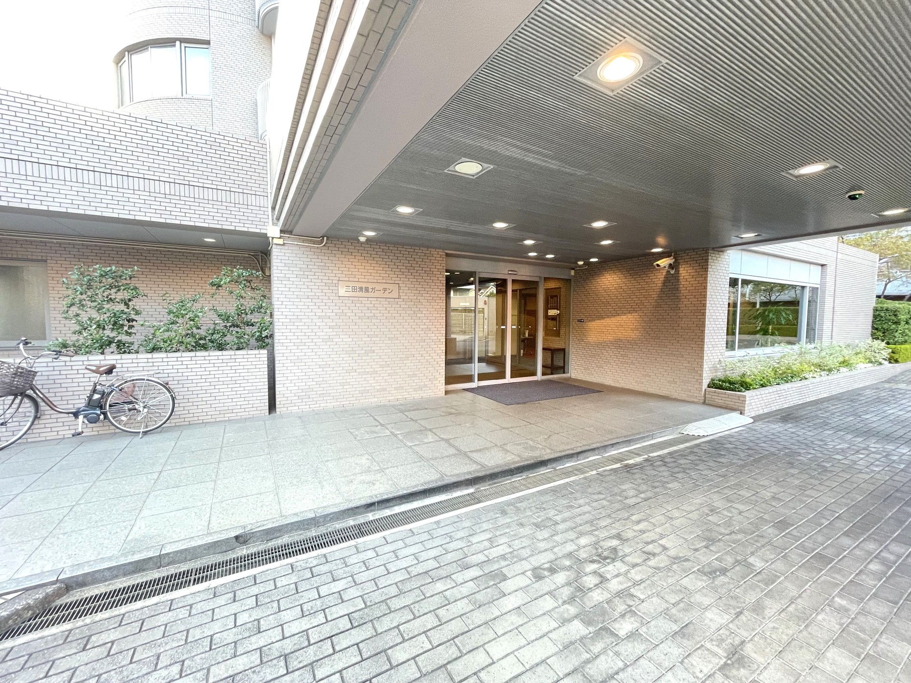 The entrance features a grand canopy. There is also a covered drop-off area where you can get in and out of your car without getting wet, even in the rain. Equipped with an automatic lock system and security cameras, it ensures a safe and secure living environment.