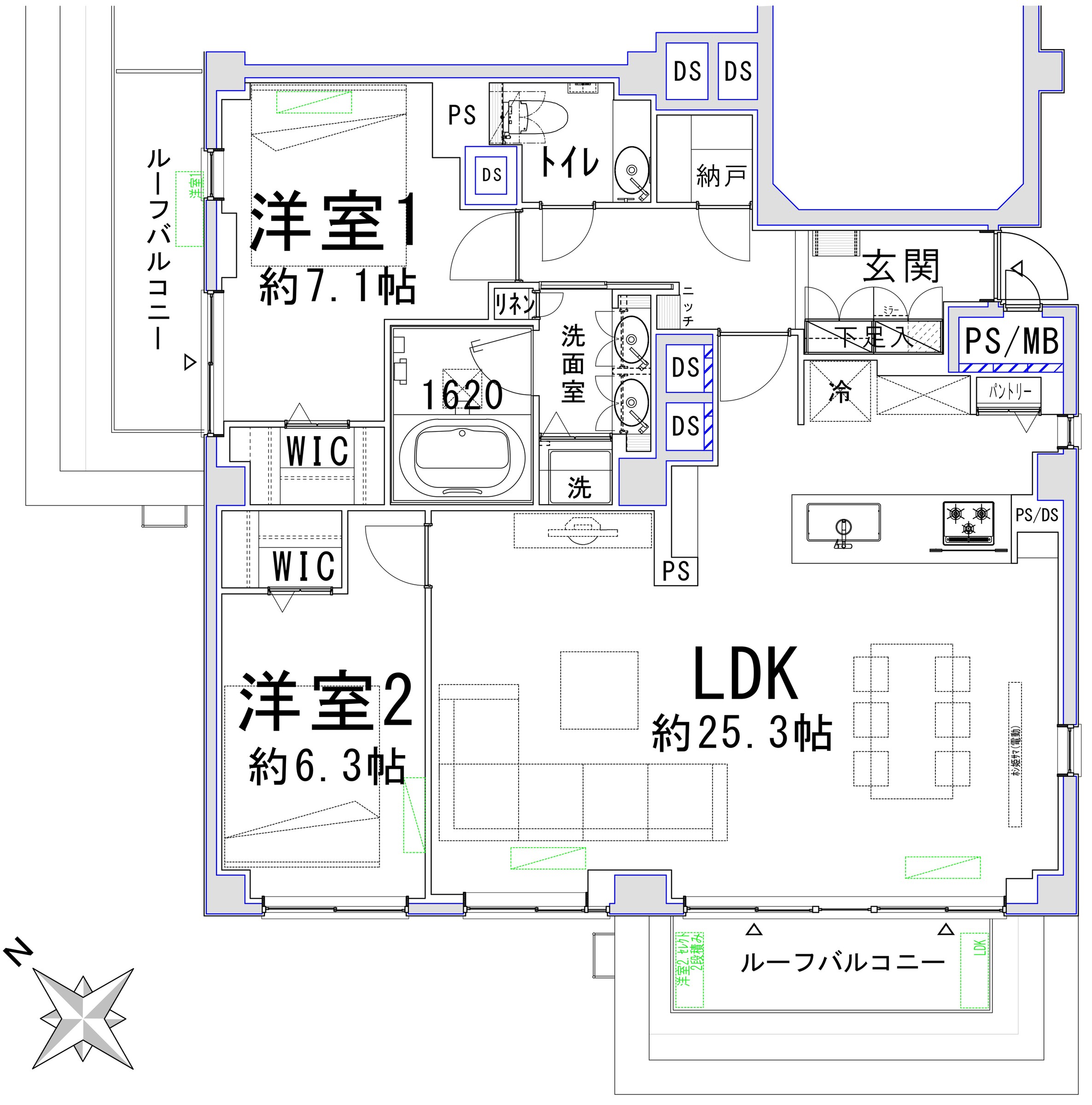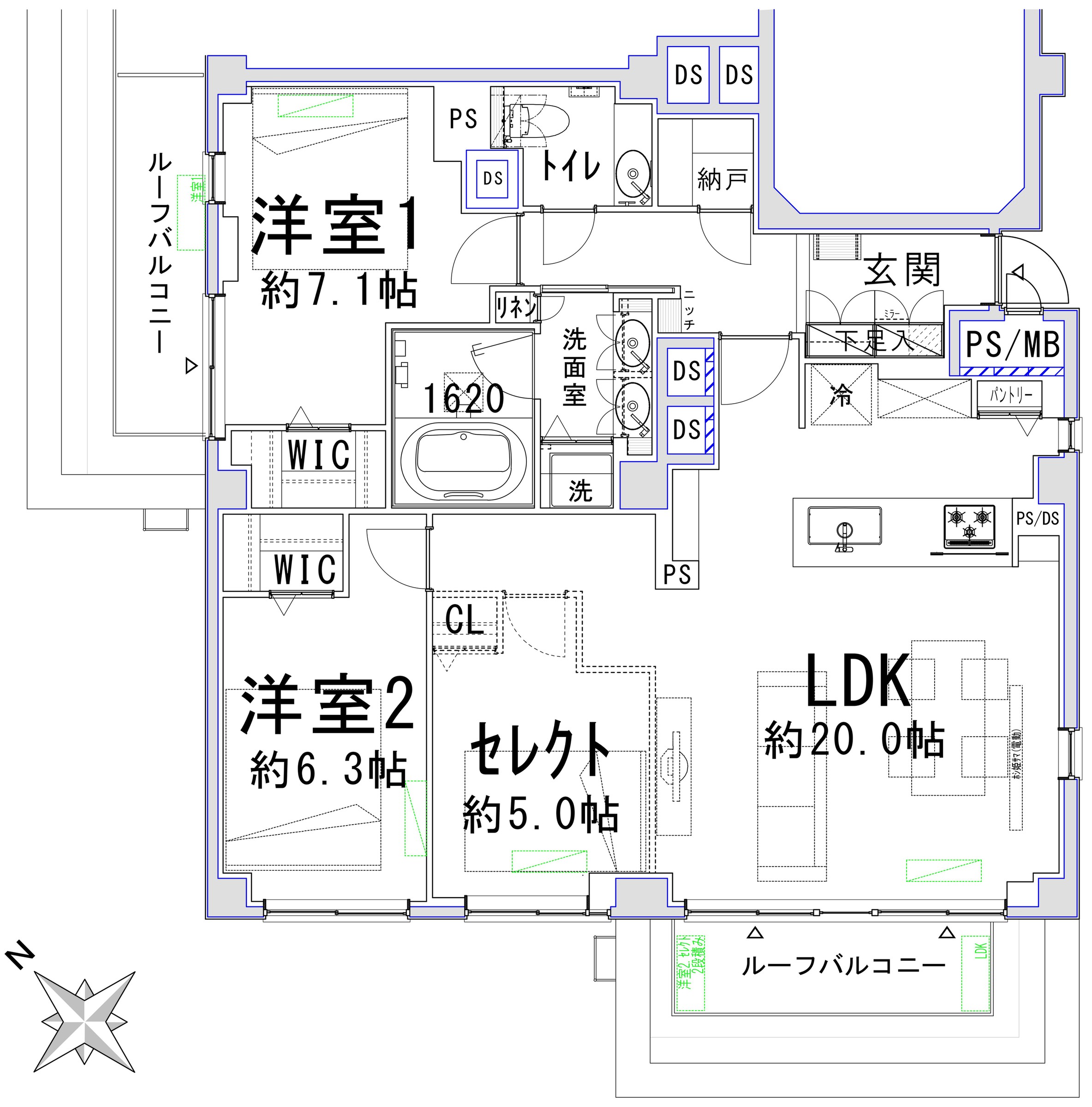 This property has a floor area of 90.16 square meters and a balcony area of 22.04 square meters, with a 2LDK layout. The spacious LDK is approximately 40.9 square meters, and there are two Western-style rooms, one approximately 11.5 square meters and the other approximately 10.2 square meters, each with a walk-in closet. The bathroom is a spacious 1620 size, and the bathroom fixtures include a twin-bowl sink and a toilet with a handwashing area, all designed with ample space in mind. This is a corner unit facing southwest with excellent sunlight.